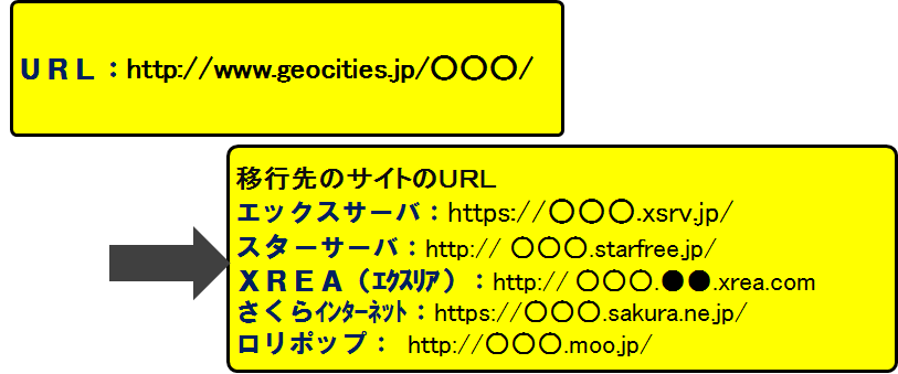 独自ドメインを取得されていない場合(ジオシティーズのドメインの場合)は、URLが移行先のドメインでのURL取得となり、移行後は新しいURLになります。